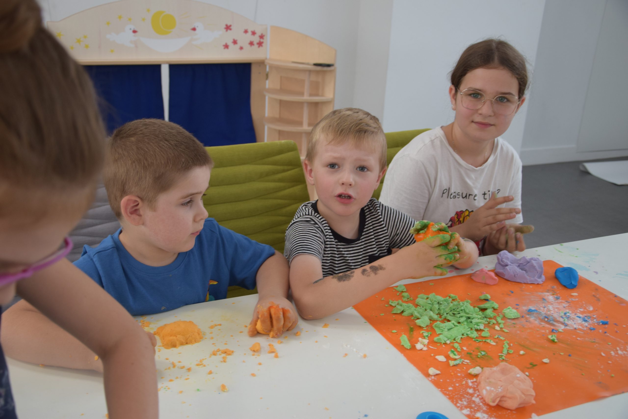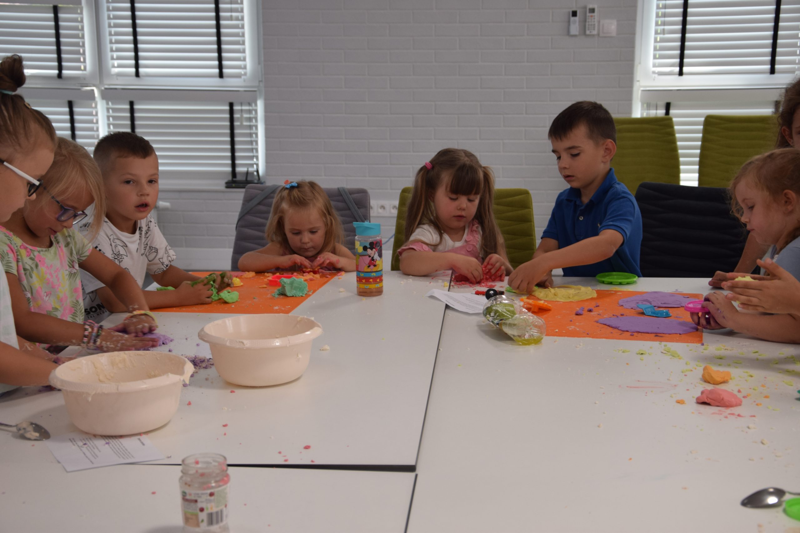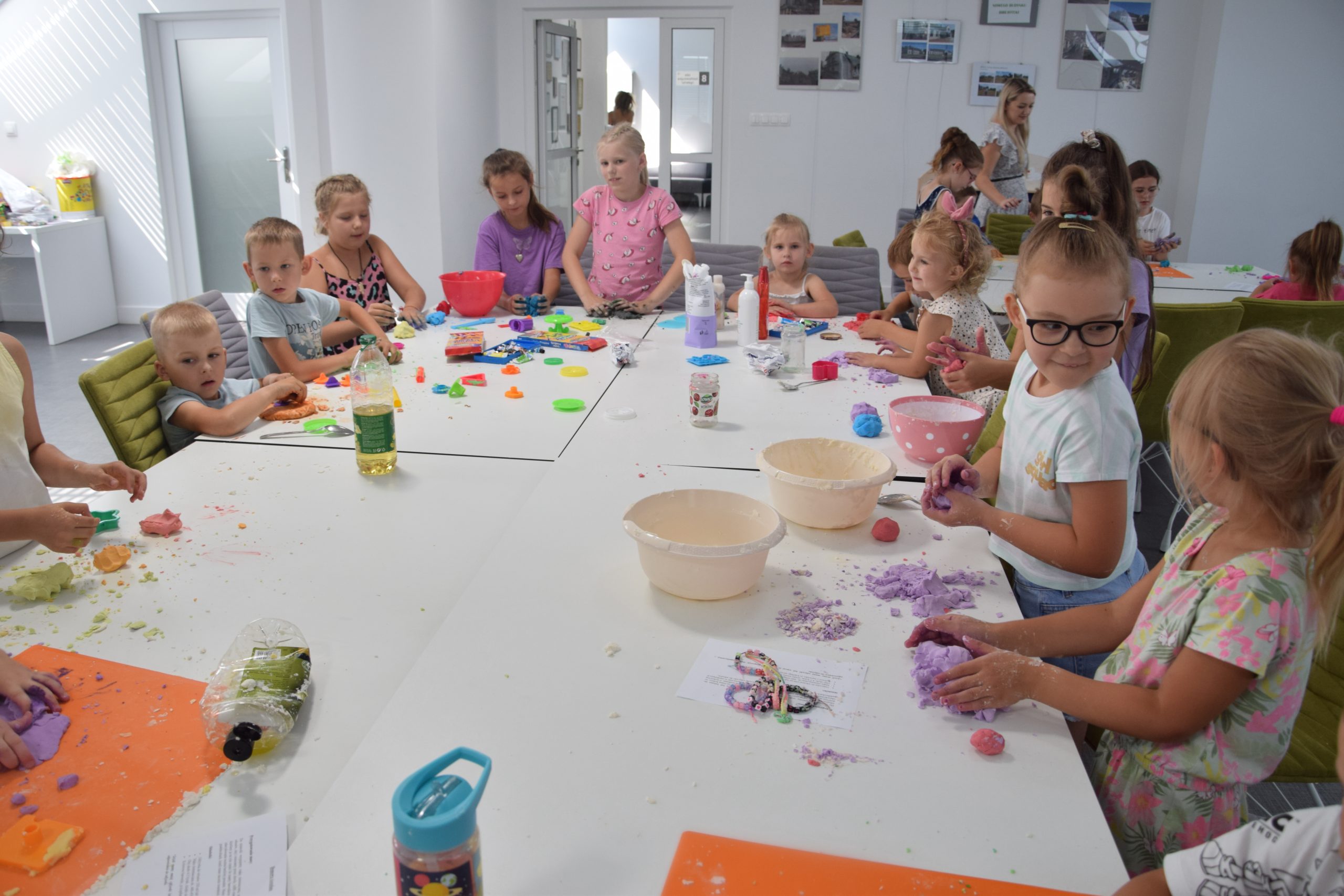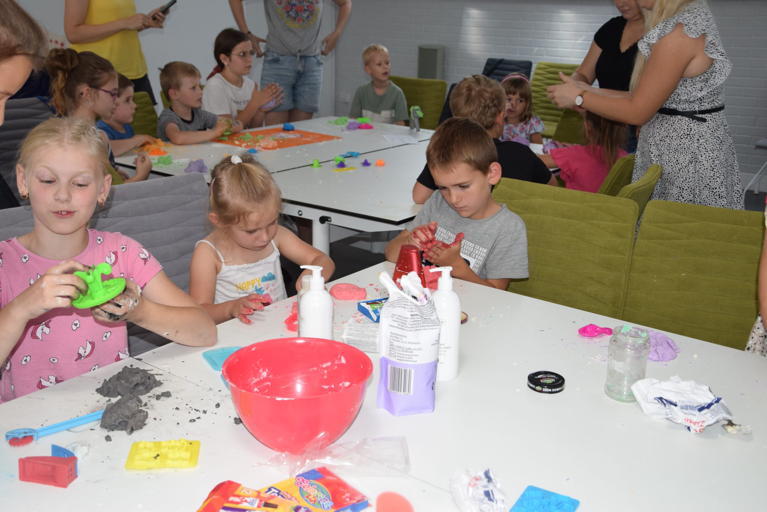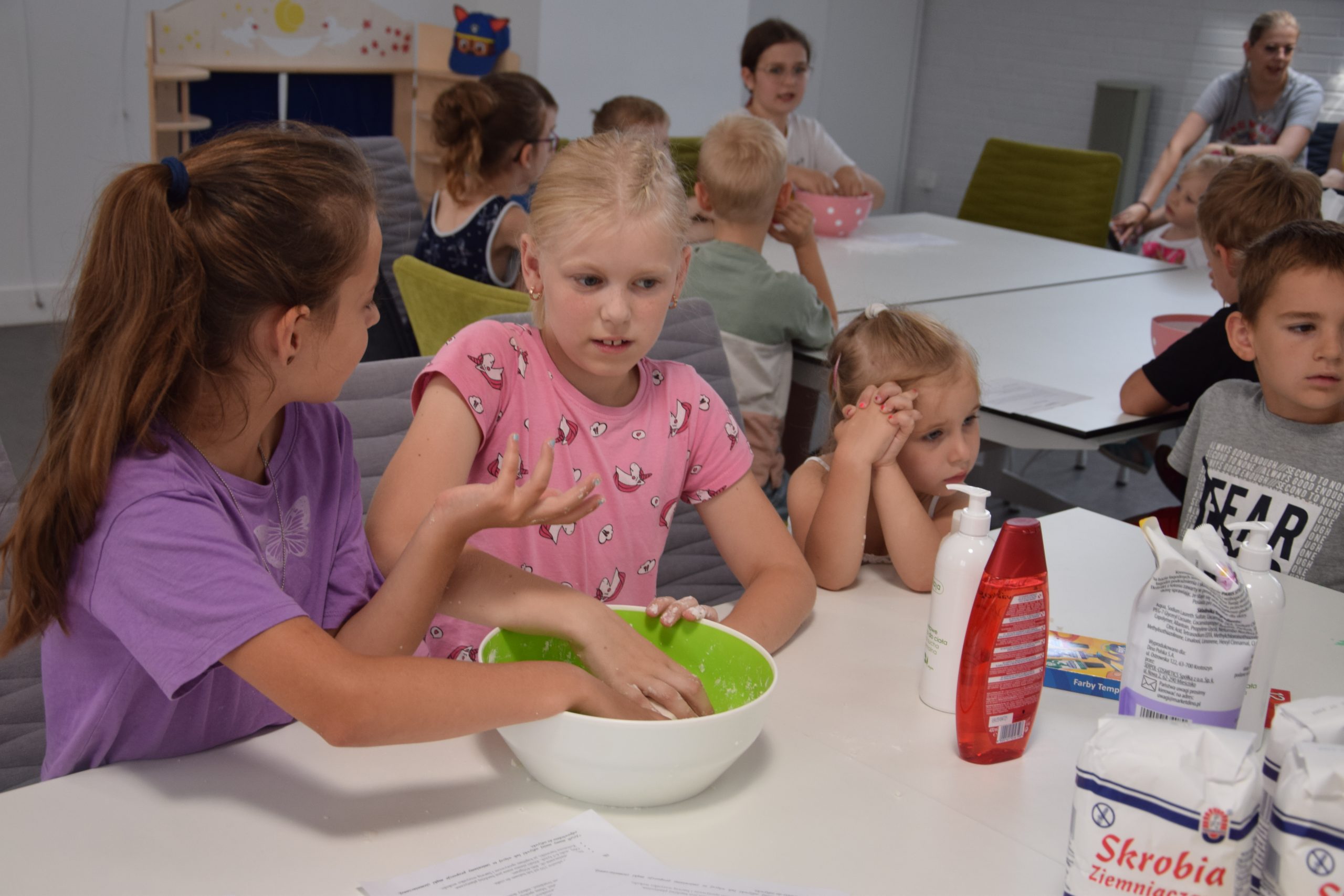 Dzisiejsze zajęcia były niezwykle ciekawym doświadczeniem. Dzieci miały możliwość samodzielnego wykonania domowej ciastoliny ze składników spożywczych oraz z kosmetyków ( szampon, odżywka itp.) Zabawy było co niemiara. W drugiej części zajęć dzieci obejrzały teatrzyk kukiełkowy, który samodzielnie przedstawiły.