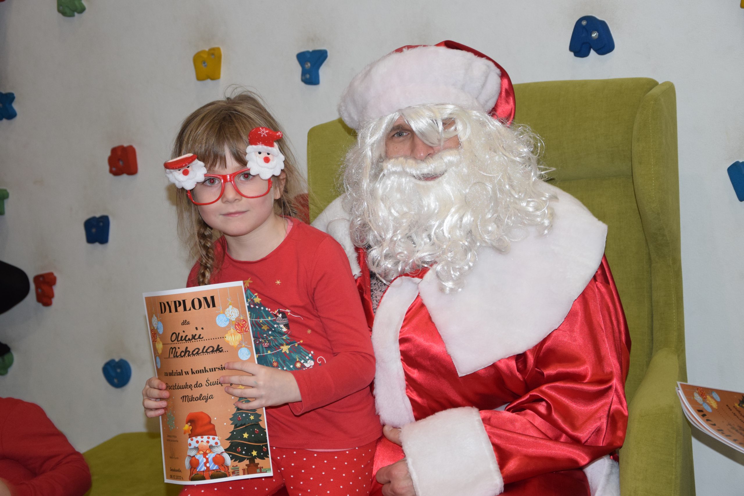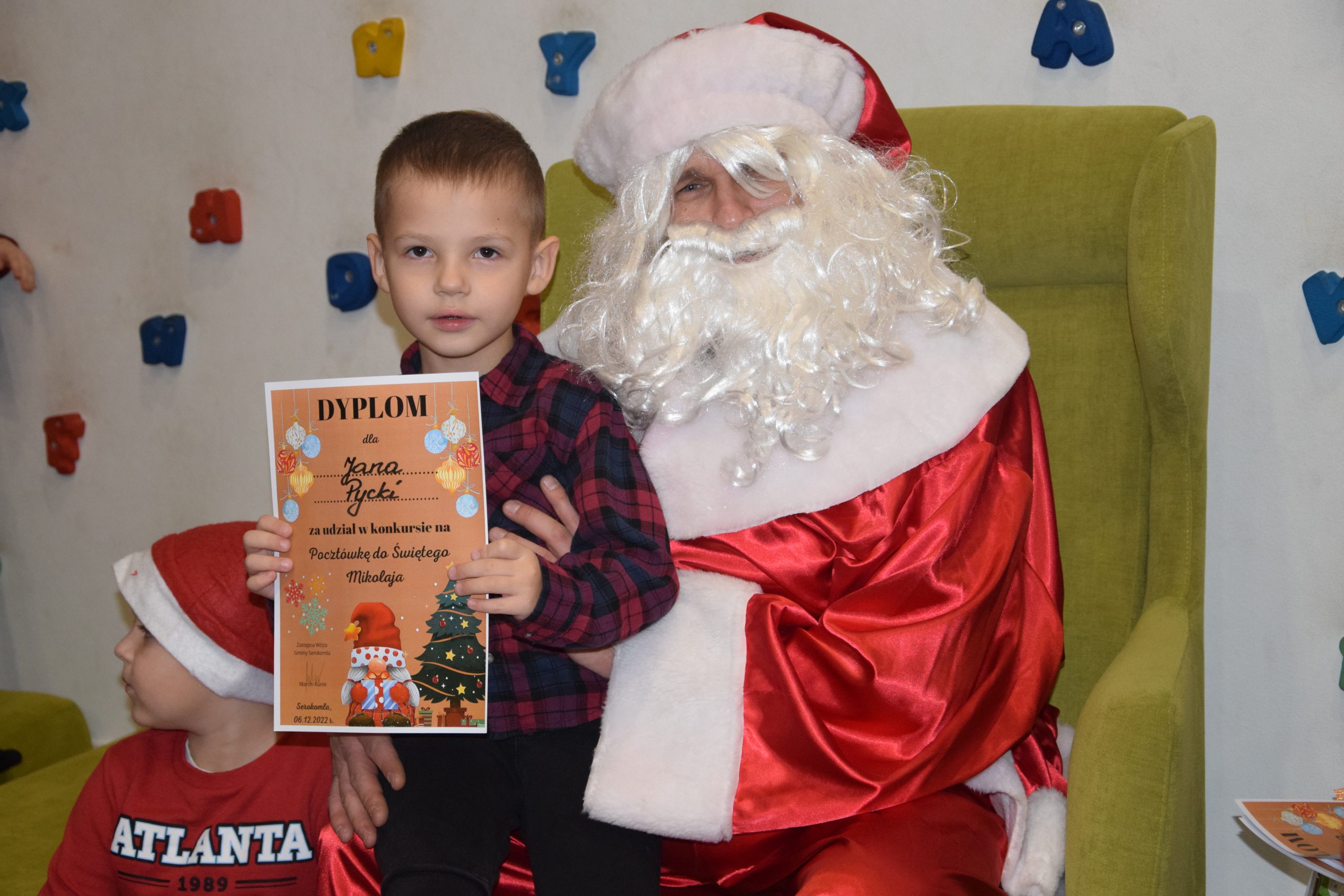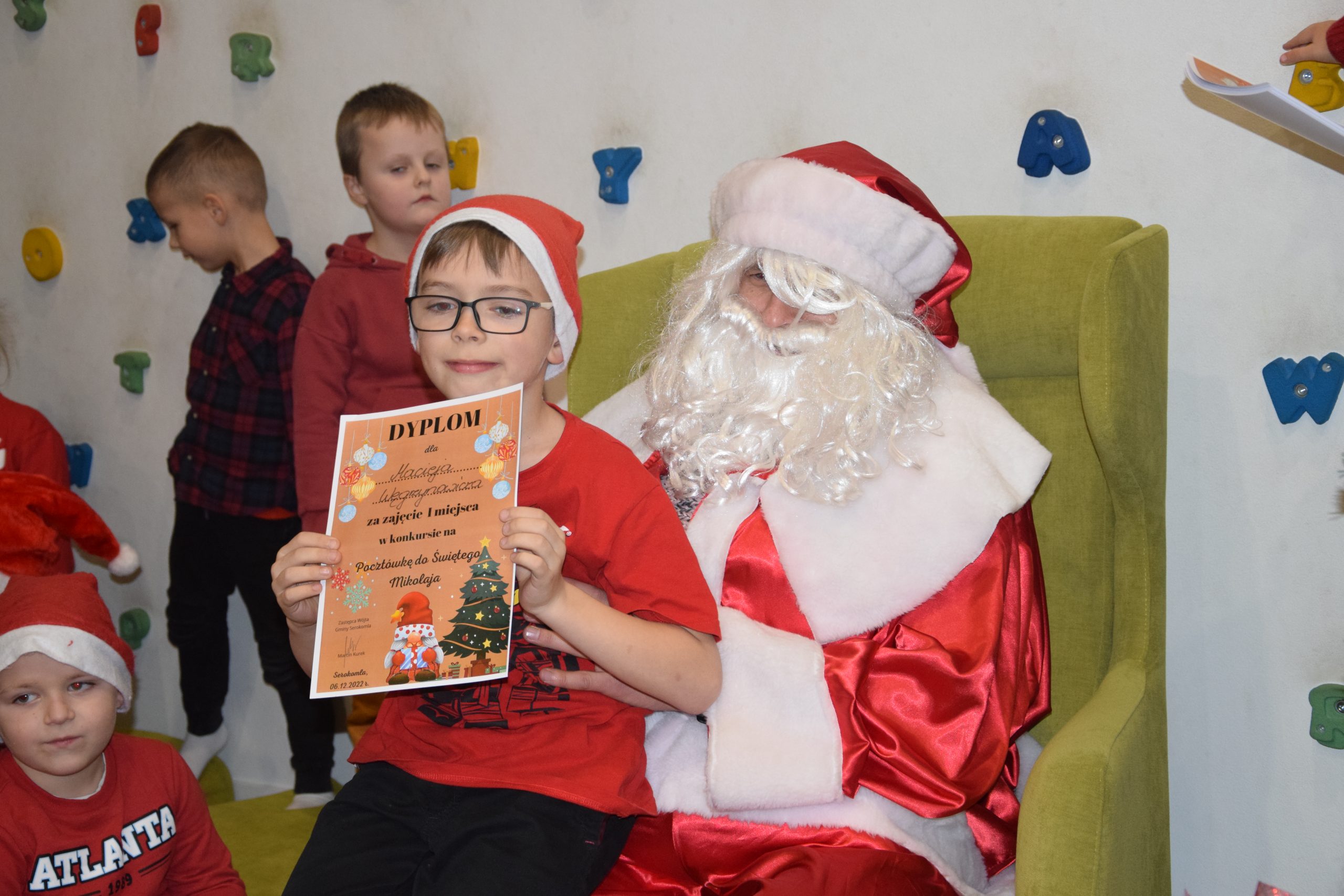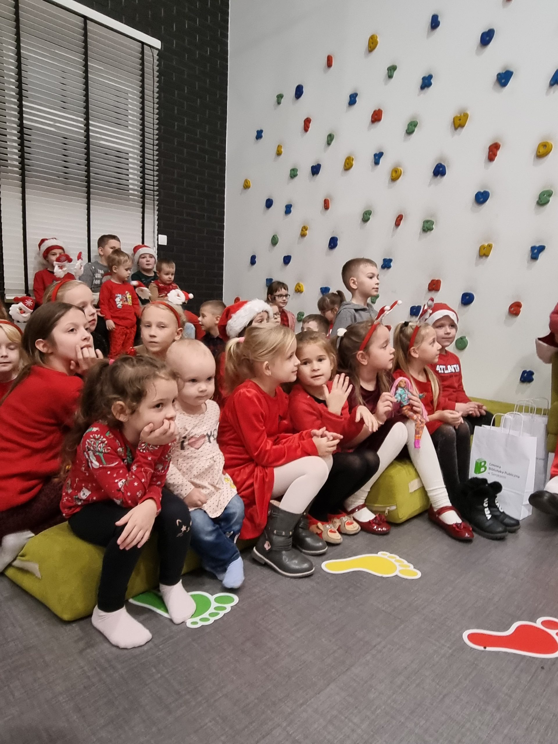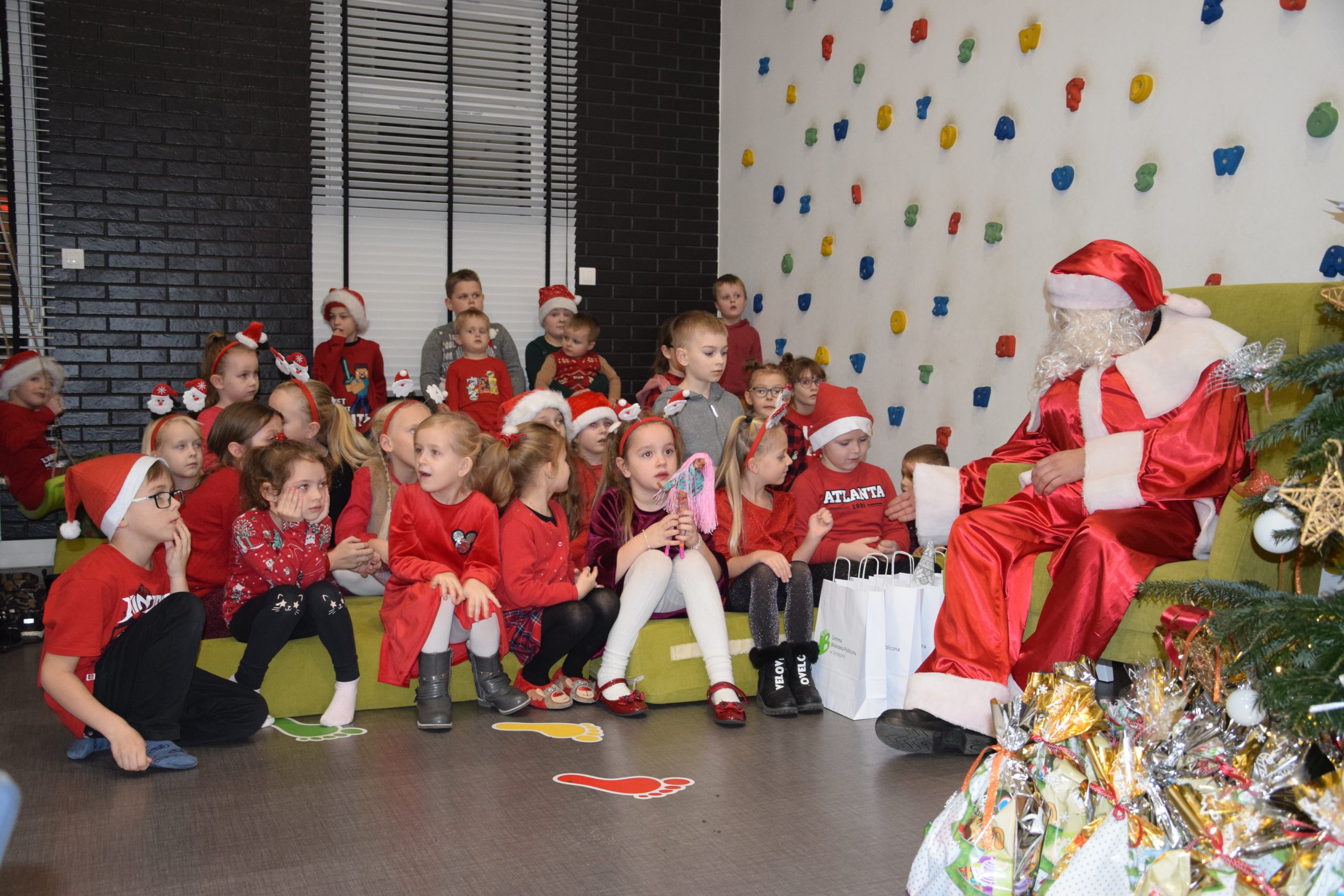 Wszystkie dzieci, które złożyły prace w konkursie pt. ,,Pocztówka do Świętego Mikołaja” 6 grudnia miały spotkanie w bibliotece z Mikołajem.