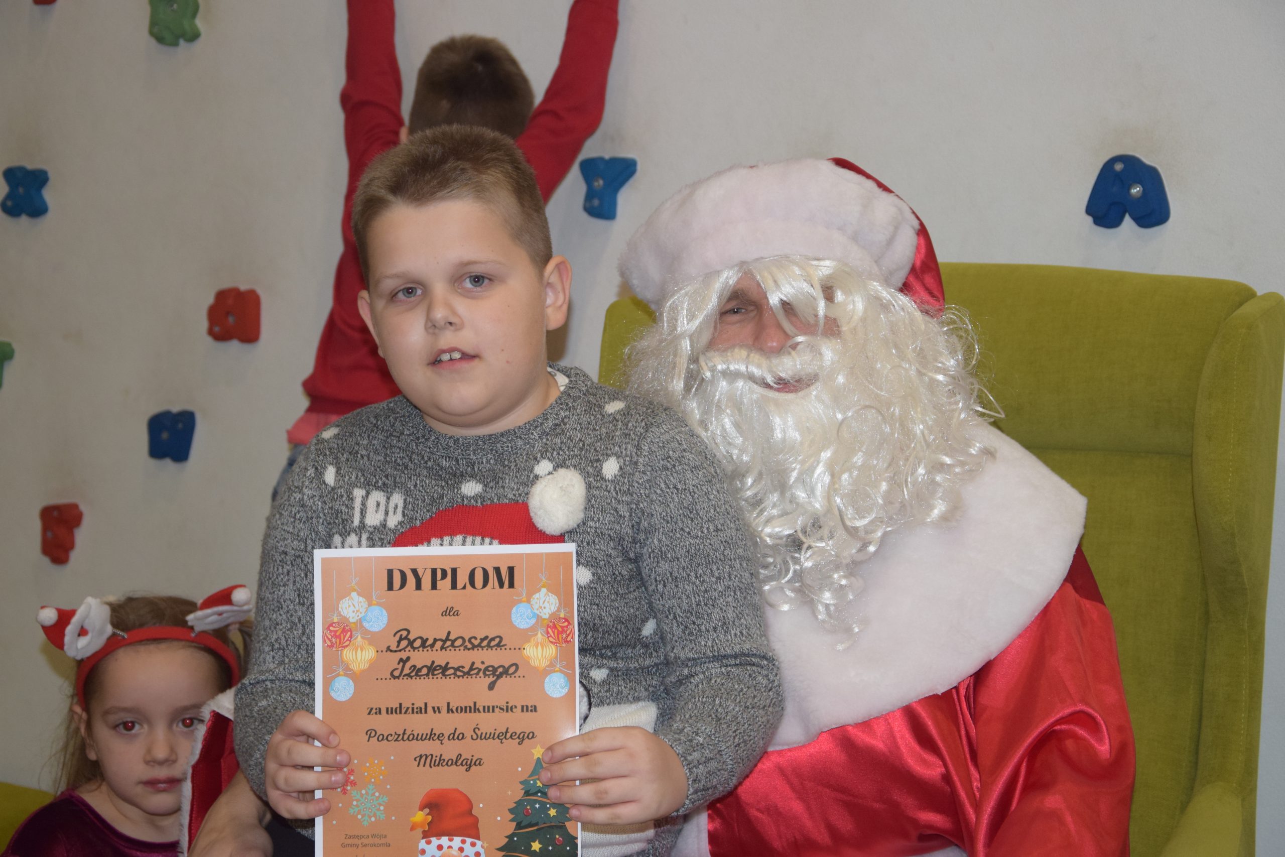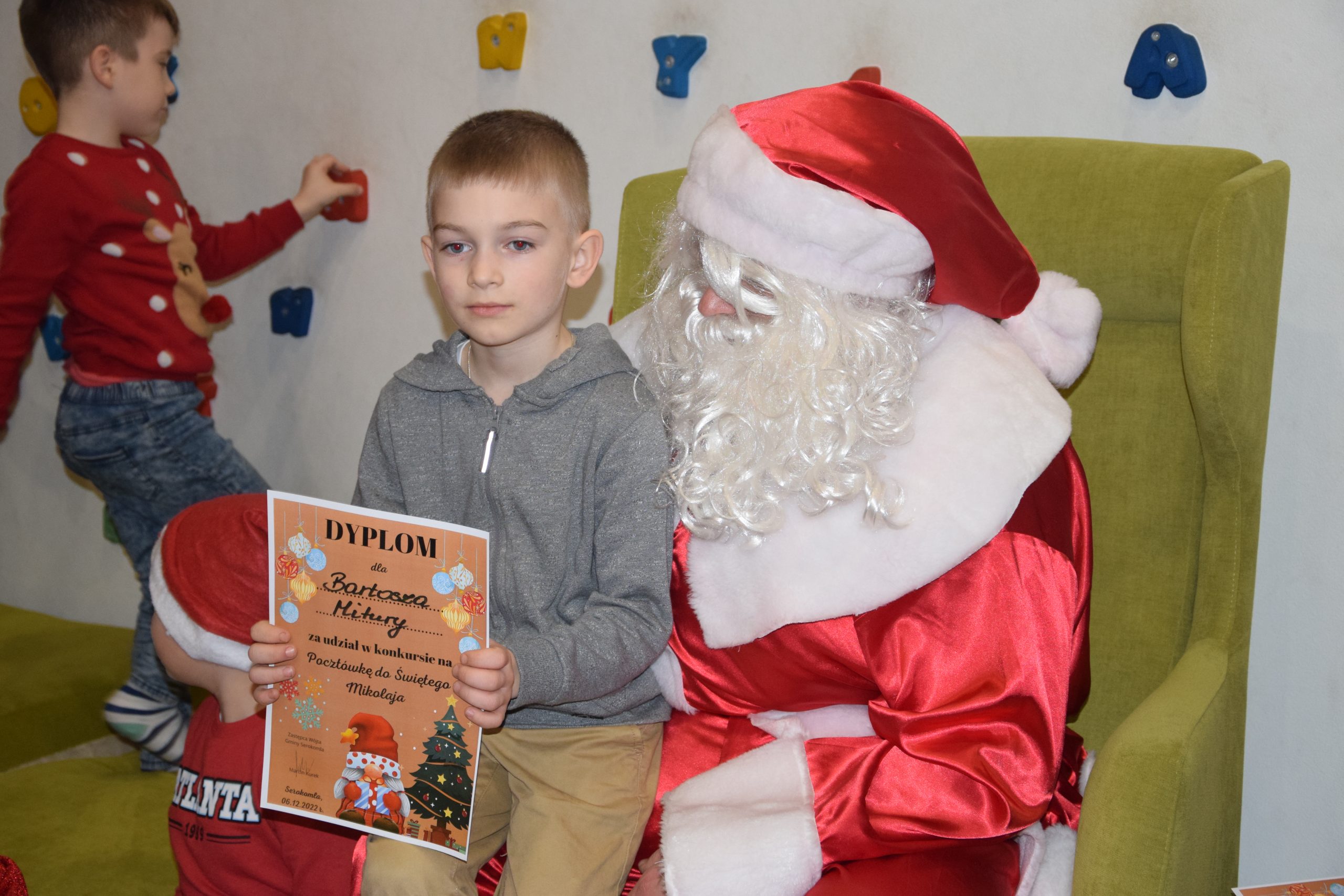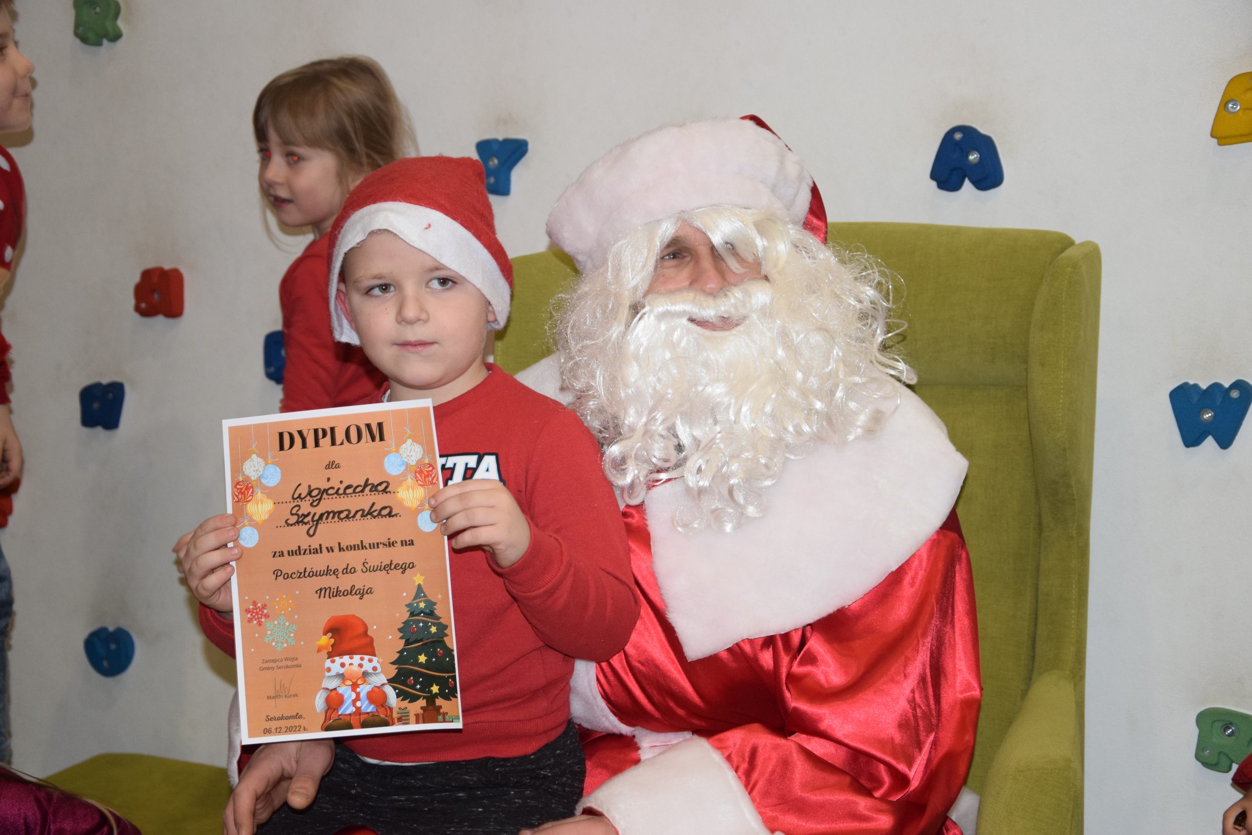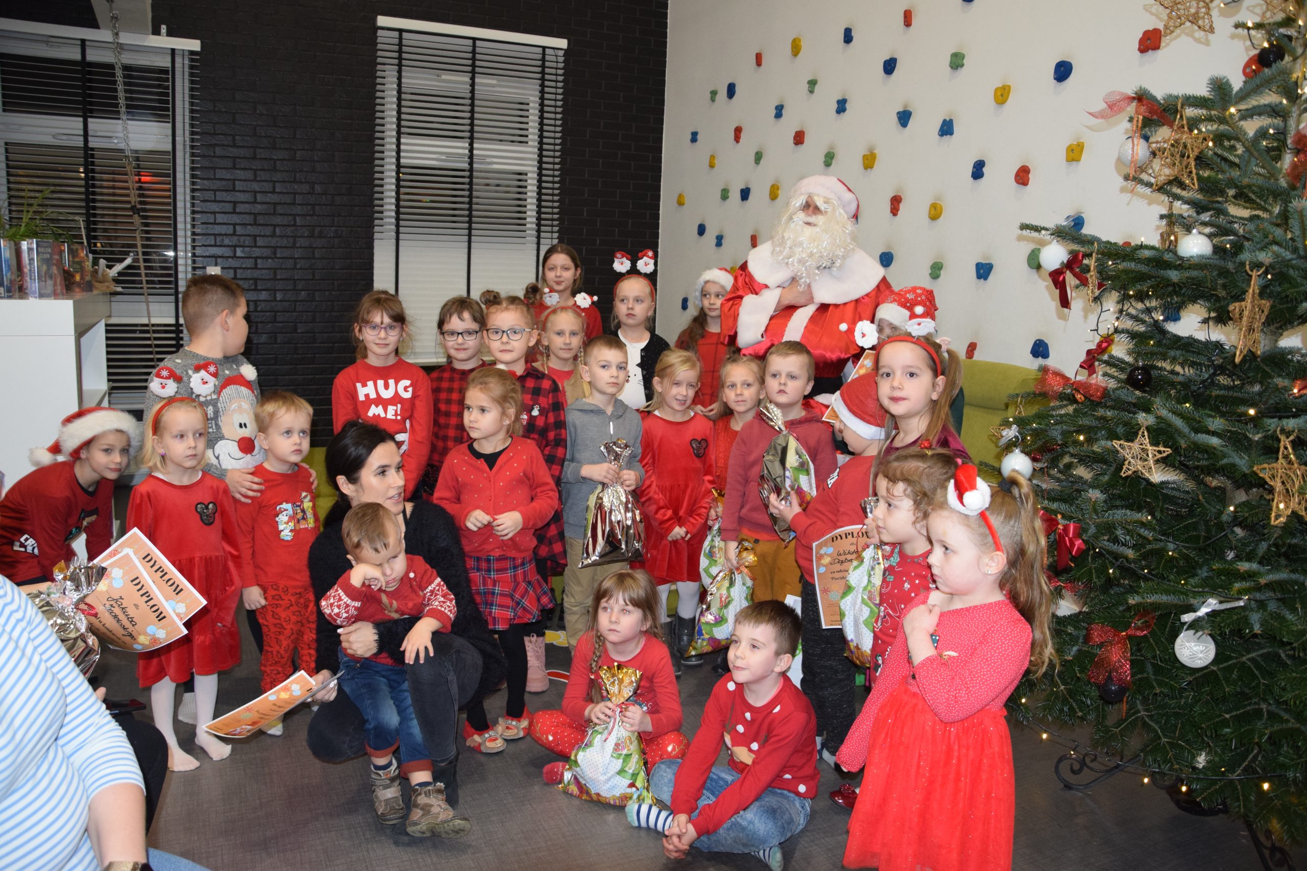 Wszystkie dzieci, które złożyły prace w konkursie pt. ,,Pocztówka do Świętego Mikołaja” 6 grudnia miały spotkanie w bibliotece z Mikołajem.